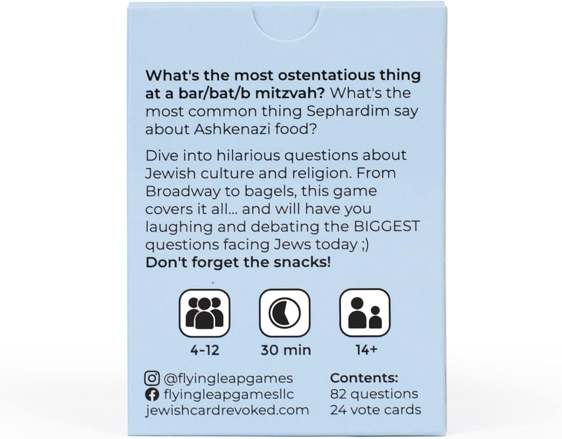 Players vote on their answers to subjective, multiple choice questions about Jewish culture and Judaism. A representative from the majority and each minority opinion then take turns defending why THEIR answer is best...in 45 seconds or less. The game brings laughs, silly debates, and funny memories to players. Jewish Card Revoked appeals toΒ secular Jews, Orthodox Jews, Jews in between (and even tested well with non Jewish groups!). The game is family friendly.